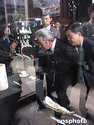 正在廣東訪問的吉爾吉斯斯坦總理尼古拉·塔納耶夫十二月一日來到廣東民間工藝博物館(陳家祠)參觀。圖為塔納耶夫總理仔細欣賞陳家祠內精美的象牙雕刻工藝品。作者:郭軍