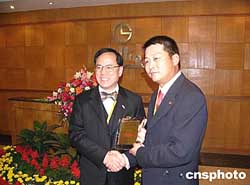 曾蔭權與金利來工業中心負責人互贈紀念品。作者:卜瑜