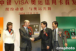 十二月八日,中國銀行聯手Visa國際組織,在北京發行全球首張以二零零八年奧運會為主題的“中銀VISA奧運信用卡”。中新社記者:廖文靜