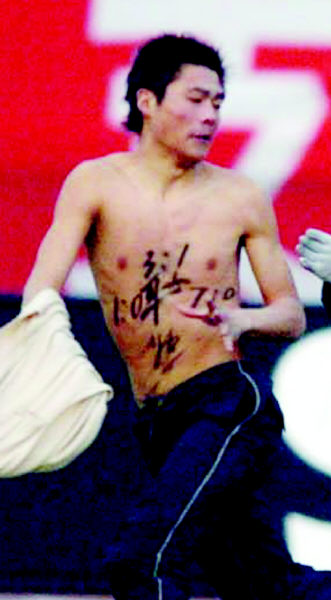 在上周六中超聯賽杯的決賽中,一名球迷在下半場突然闖入賽場,并且邊跑邊脫去上衣,并顯露出胸前用墨汁寫成的“1比0、3比1、7比0、恥悲”字樣。在現場保安和警察的圍堵下,該球迷最后被警察帶走。