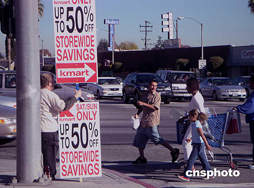 十二月十八日的美國洛杉磯街頭,一位打工男孩在烈日下手舉超級市場周末圣誕大減價的指示牌,吸引來往車流人群前往采購。中新社記者:賈國榮