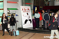 影星周星馳自編自導自演的《功夫》23日正式上映,香港開畫票房收411萬元,創(chuàng)下今年中西片最高開畫票房紀錄,而在內地首日亦勁收1千萬元人民幣。圖為《功夫》宣傳海報放在戲院門前顯眼位置。作者:譚達明