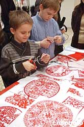 外國兒童正在學剪紙。來自白俄羅斯、阿富漢等國的駐華大使歡聚北京民間藝術展歡度圣誕假期。作者:韓藝冰