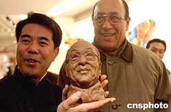 十二月二十六日,正在中華世紀壇舉行的北京民間藝術展上,泥塑藝術家張榮達(左)將剛制作完成的阿富汗駐華大使萊伊泥塑與萊伊本人(右)一起對比展示,令在場觀眾贊嘆不已。作者:韓藝冰