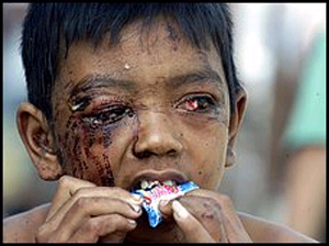 在一個個受災國家,兒童成了這次地震引發的海嘯的最大受害者,排山倒海的巨浪卷走和淹死了成千上萬的兒童,野蠻地奪去了幾乎整個一代亞洲人的生命。
