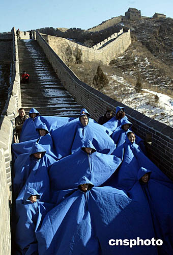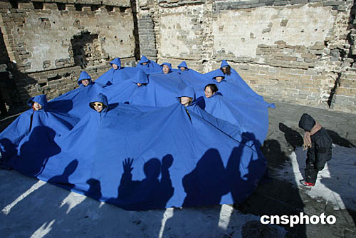 一月三日,十二名中國藝術家在北京古老的長城上,演繹法國藝術家尼可拉的行為藝術作品《藍斗篷和中國藝術家》。中新社記者:史利