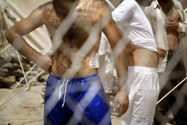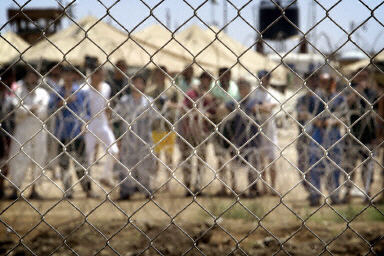 5月17日,一些伊拉克囚犯站在巴格達西郊的阿布格萊布監(jiān)獄鐵絲網(wǎng)后。