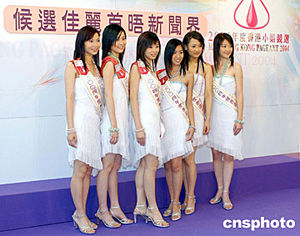 《2004年度香港小姐競選》5月18日在香港舉行記者會,十八位候選佳麗首度會晤傳媒。圖為1---6號候選佳麗:朱慧敏、余妍慧、毛嘉欣、鄧慧琦、楊施詩、徐子珊(左起)。作者:鄧慶樂