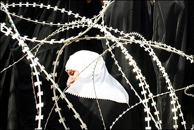 一名伊拉克婦女站在阿布格萊布監獄外的帶刺鐵絲網旁,希望獲得親人的消息。