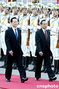 中國國務院總理溫家寶五月二十日在北京歡迎越南總理潘文凱訪華。中新社記者:鄭萍萍