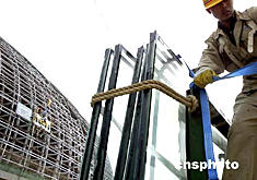 國家大劇院橢球屋面的中央,是由兩條不規(guī)則漸開曲線圍成的弧形玻璃幕墻和穹頂,雖然玻璃還沒有安裝上去,但是整個構(gòu)造還是如同一簾拉開的幕布。據(jù)國家大劇院金屬屋面及幕墻工程的總指揮羅憶介紹,當(dāng)天要安裝的就是裝點(diǎn)這塊“幕布”的玻璃,這些玻璃是國家大劇院的最外層的幕墻玻璃,也是整體景觀效果最明顯的部分。