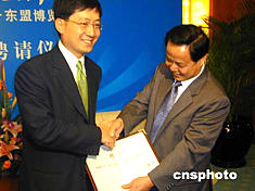 五月二十八日,廣西自治區主席陸兵(右)在南寧向香港貿發局總裁林天福頒發聘書,聘請他為中國—東盟博覽會高級顧問。作者:蔣雪林