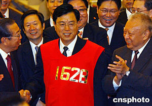 中共中央政治局委員、廣東省委書記張德江,五月三十一日來到香港聯合交易所進行訪問,圖為出市代表贈送張德江紅馬甲。中新社記者:錢興強
