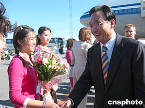 全國人大常委會委員長吳邦國五月三十一日飛抵丹麥首都哥本哈根,一名高中女留學生向吳邦國委員長獻花。作者:戴亞平
