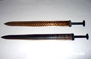 六月初,湖北省博物館專家對所謂“高仿真”的越王勾踐劍進行了技術鑒定,有關專家認為所謂“高仿真”劍與真品差異很大,并聲明“高仿真”行為不合法,應立即停止。近日,湖北荊州有人聲稱“破解”了越王勾踐劍千年不銹之謎,準備建立生產基地批量生產“高仿真”劍。圖為越王勾踐劍(下)與“高仿真”劍(上)的對比。作者:艾啟平