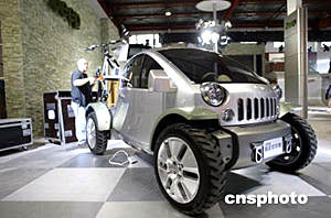 六月七日,一名工作人員在北京國(guó)際展覽中心展臺(tái)上布置一款新型的JEEP概念車。二零零四年北京國(guó)際汽車展覽會(huì)將于二零零四年六月十日至十六日在中國(guó)國(guó)際展覽中心和全國(guó)農(nóng)業(yè)展覽館舉行。中新社記者:盛佳鵬