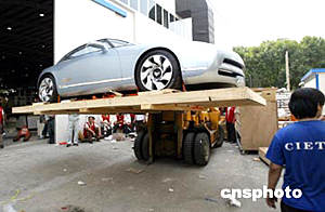 圖為工作人員正忙著將一款東風(fēng)雪鐵龍新型跑車運(yùn)進(jìn)展廳。中新社記者:盛佳鵬