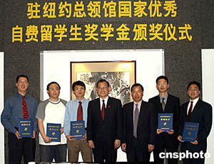 “國家優(yōu)秀自費(fèi)留學(xué)生獎(jiǎng)學(xué)金”評選工作去年開始在美國、日本、英國、法國和德國五個(gè)國家試點(diǎn),首屆共有九十五人獲獎(jiǎng),美國三十人,其中紐約總領(lǐng)館領(lǐng)區(qū)的美國東北部十個(gè)州共有六人獲獎(jiǎng),分別是:哈佛大學(xué)政治學(xué)專業(yè)的閻小駿、麻省理工學(xué)院從事媒體實(shí)驗(yàn)室的潘鵬凱、康乃爾大學(xué)電子工程專業(yè)的吳華強(qiáng)、紐約大學(xué)理論化學(xué)專業(yè)的張大為、新澤西理工學(xué)院通信與信號處理專業(yè)的何磊、俄亥俄州立大學(xué)化學(xué)物理專業(yè)的劉進(jìn)軍。