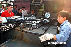 六月八日下午,發生坍塌事故的北京大安山煤礦的工人正準備將大批鉆桿運往井下。六月六日,位于北京郊區的大安山煤礦發生礦井塌冒事故,井下十名礦工被困。為了直接進入坍塌地點營救被困礦工,救援人員目前正在全力打通巷道,如果進展順利,九日上午可望打通。六月八日,救援人員已成功向坍塌地點注入氧氣。中新社記者:張煒