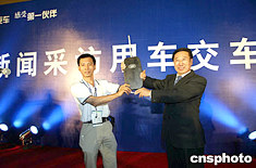 六月八日晚,一汽集團在北京國際會議中心舉行新聞記者見面會,一汽老總竺延風等在見面會上解答了眾多記者的提問,會后舉行新聞采訪用車的交車儀式,第一汽車集團公司副總經理安德武向媒體代表頒發“車鑰匙”。中新社記者:盛佳鵬