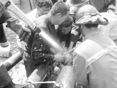 據朝陽市消防局副局長姚安介紹:“我們共出動70余名官兵、10臺消防車。由于汽油管道發生炸裂,引起了另一條柴油輸送管道的法蘭盤(管道的接頭)向外泄漏柴油,現在這7條輸油管道每條里都有5噸油,一旦引爆后果不堪設想。我們用兩臺泡沫滅火車和若干水槍給管道降溫,同時用來稀釋泄漏的柴油,并更換法蘭盤。”