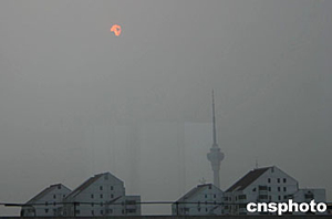 六月十四日傍晚,北京遭遇大風揚塵天氣,夕陽在烏云、沙塵作用下,呈現出少見的天象。中新社記者:武仲林