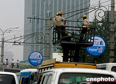 北京電力搶修工人六月周末在街頭排除故障。中國(guó)國(guó)家電網(wǎng)公司六月舉行的迎峰度夏安全生產(chǎn)電視電話會(huì)議決定,目前電煤供應(yīng)很不樂觀,很可能導(dǎo)致機(jī)組停運(yùn)。電監(jiān)會(huì)組織制定的《電網(wǎng)大面積停電事件應(yīng)急預(yù)案》已經(jīng)提交給國(guó)務(wù)院辦公廳報(bào)批。中新社記者:賈國(guó)榮