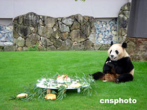 中國第二只“海歸”大熊貓“雄浜”六月二十一日將離開日本回到中國,在即將離別之際,日本白浜野生動物園特別為“雄浜”準備了由竹子、香蕉、蘋果組成的一個特大“水果蛋糕”。圖為“雄浜”草坪上盡情享受在日本最后一頓晚餐。作者:肖龍聯(lián)