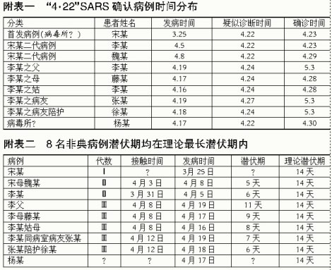 另外,賀雄介紹,以宋某為一代病例,從后續(xù)病例與前代最早接觸時間為暴露點開始計算,北京“4.22”SARS疫情中傳播鏈清晰的8名病例的潛伏期均在傳染性非典型肺炎理論最長潛伏期之內(nèi)。但首發(fā)病例宋某的接觸病毒時間和潛伏期尚無法推算;病毒病所博士生———患者楊某的接觸時間、傳播鏈位置和潛伏期亦存在疑問。