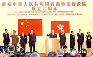 中新網(wǎng)7月1日電 今天是香港回歸七周年。香港特區(qū)政府今天早上舉行升旗儀式暨慶祝酒會(huì),慶祝香港特別行政區(qū)成立七周年。
