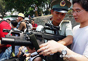 為慶祝香港回歸祖國七周年,中國人民解放軍駐香港部隊于七月一日舉行三軍軍營開放活動,在赤柱軍營參觀者對各種武器展示充滿興趣。作者:錢興強