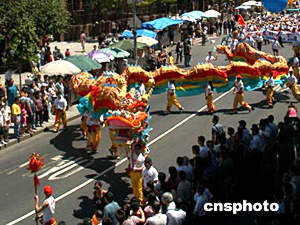 二零零四年七月四日是美國獨立二百二十八周年。七月三日中午,數千華人聚集在紐約曼哈頓中國城舉行游行活動,慶祝美國國慶。作者:陳建