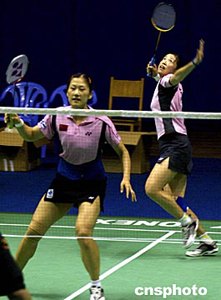 中國羽毛球隊女雙隊員黃穗(前)、上屆奧運會混雙冠軍高崚,十五日在湖南益陽訓練基地緊張訓練,備戰雅典奧運會。中新社記者:宋吉河