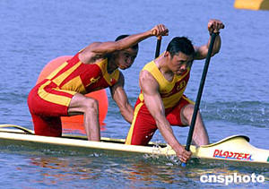 中國國家皮劃艇隊男子劃艇運動員孟關良(前)、楊文軍(后)七月二十六日在山東日照水庫訓練基地進行奧運賽前模擬實戰訓練,備戰雅典奧運會。中新社記者:張勤