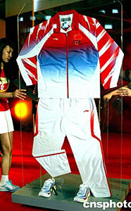 七月二十七日,李寧公司贊助第二十八屆奧運會中國代表團新聞發布會在北京舉行,李寧公司正式推出以“錦繡中華”領獎服和“極光”領獎鞋為主的領獎裝備。中新社記者:鄭萍萍