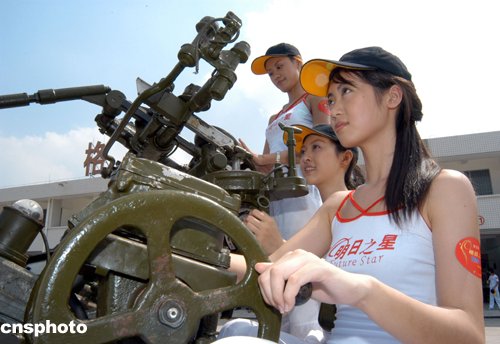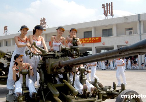 第五屆“明日之星”浪奇杯影視新星大賽的六十多名帥哥美女,八月一日到廣東預備役高炮師接受軍事訓練。作者:劉衛勇