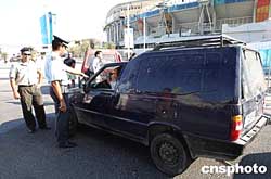 (當地時間)二○○四年八月二日上午,多名希臘警察在雅典奧運會主會場嚴格檢查進入該地的人員車輛,以加強會場安保。中新社記者:任晨鳴