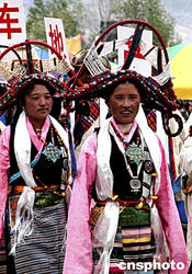 今夏西藏江孜地區農民在盛大民間傳統活動中展示當地藏族服飾。中國藏區地域廣泛,藏族服飾十分豐富,然變化最大的在于他們的頭飾。中新社記者:王麗南