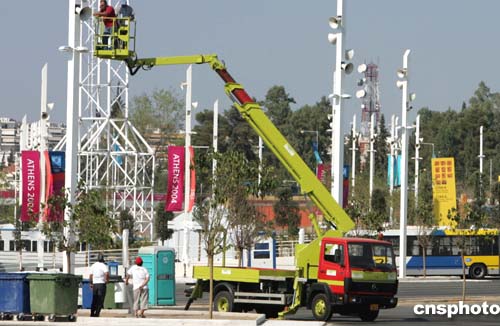 (當地時間)二○○四年八月三日,希臘雅典奧運會主體育場外的配套工程緊張進行,工人們冒著烈日安裝擴音設施。中新社記者:任晨鳴