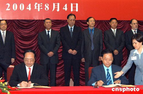 八月四日,中國人民銀行副行長李若谷與澳門金融管理局主席丁連星在澳門特區政府總部多功能廳分別代表雙方簽署澳門銀行辦理個人人民幣業務合作備忘錄,澳門特別行政區行政長官何厚鏵等出席簽字儀式。作者:梁永強