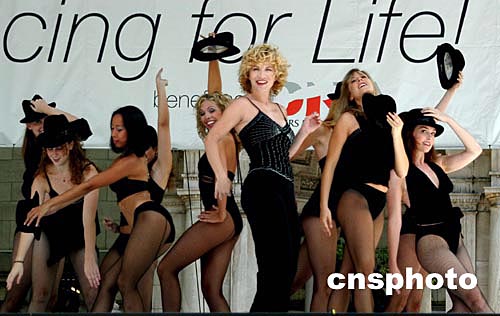 美東時間八月五日中午,紐約市中心布萊恩特公園內舉辦《為生命起舞》的義演活動,數十位百老匯藝員載歌載舞,為艾滋病患者募捐,支持他們在社會生活中繼續獲得平等權利。圖為費麗莎·芬利(Felicia Finley)(中)引領舞者,表演《用強勁的音符打動我》。作者:陳建