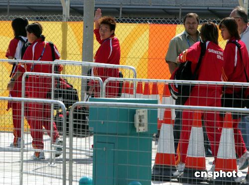 當地時間8月6日下午,參加雅典奧運會的中國女足抵達雅典,隊員畢妍在嚴密的保衛下向遠在隔離線外的記者招手。作者:任晨鳴