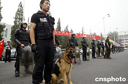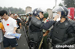 8月7日,在亞洲杯決賽中國隊對日本隊的比賽開賽之前,大批的防爆警察進駐北京工人體育場,確保賽場的安全。圖為一名防爆警察為同伴擦汗。中新社記者:盛佳鵬