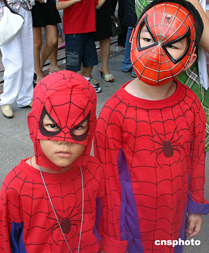 為慶祝臺北偶戲館開張,八月七日臺北街頭舉行了戲偶隊(duì)伍游行。圖為兩名打扮成電影“蜘蛛俠”造型的小朋友。作者:董會峰