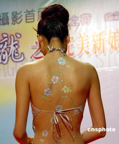 2004年8月7日,南京市某商家在其新產(chǎn)品推介會上,再次請來模特現(xiàn)場彩繪秀,以吸引消費者眼球。作者:王耀武