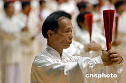 福建老年人體育協會組織的兩千多名太極功夫高手,8月8日上午,在福州舉行的“紀念鄧小平同志誕辰一百周年大會暨億萬老年人健身活動”中一展身手。會員遍及全省各地的福建“老體協”,現有會員一百三十九萬多人,是福建規模之最的社團。作者:鄭祚聲