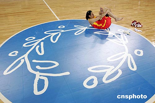 當地時間八月十日,中國女籃進行從克里特島抵達雅典后的首場訓練,宋曉云訓練結束后在有雅典奧運會徽的中圈弧內進行放松運動。作者:毛建軍