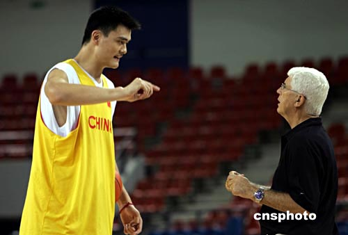 當滿頭銀發的中國男籃主帥哈里斯姍姍出現在訓練館內時,隊員們開始集合,此時比預定的訓練時間晚了半個多小時。在例行的熱身活動后,中國男籃分成黃、紅兩隊進行了幾套戰術的演練。由姚明、易建聯、李楠、劉煒、朱芳雨等組成的黃隊無疑是中國男籃的主力陣容。