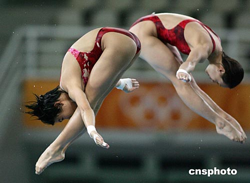 中國女子十米跳臺雙人選手李婷、勞麗詩當地時間八月十二日下午在雅典奧運跳水賽場進行賽前訓練。中新社記者:毛建軍