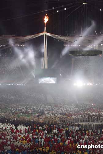 當地時間八月十三日晚,第二十八屆奧運會在希臘雅典開幕。圖為主體育場奧運主火炬被點燃。中新社記者:毛建軍